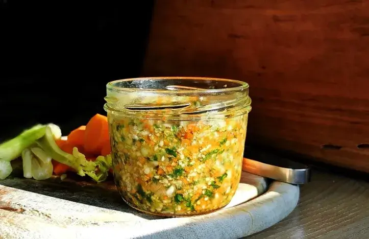 Auf je 100 g der fertigen Mischung je 10 g Salz geben, mischen, in Schraubgläser abfüllen und kühl aufbewahren. Das Salz konserviert für mindestens 12 Monaten.
