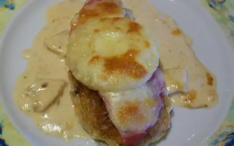 Sauce in eine Auflaufform gießen, Schnitzel darauf legen. Auf jedes Schnitzel zwei Schinkenhälften legen, eine Ananascheibe und anschließend Käse darüber streuen. Im Ofen überbacken bis der Käse schön verlaufen und knusprig goldbraun ist.
