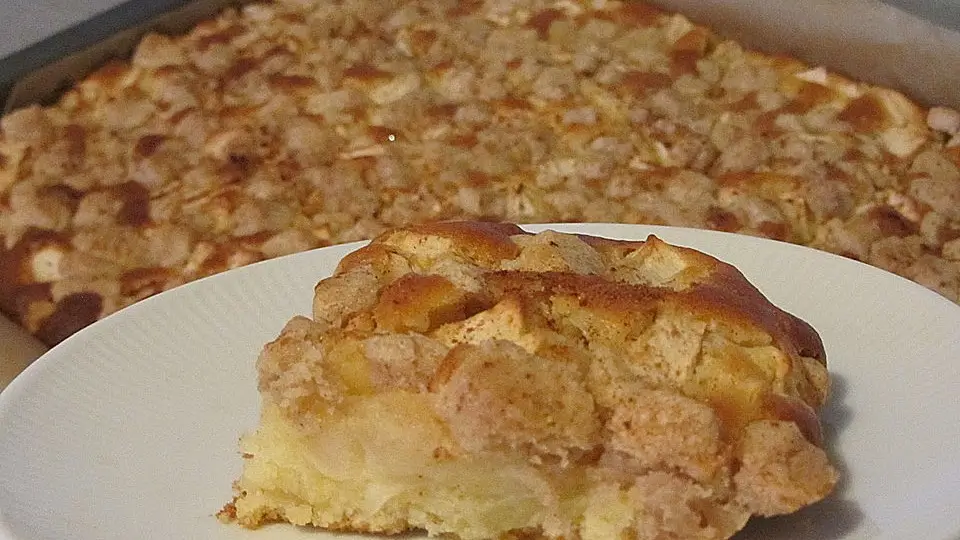 2. Für den Rührteig 250 g Butter, 150 g Zucker, Vanillinzucker und 1 Prise Salz ca 5 Min cremig rühren. Eier nacheinander unterrühren. 375 g Mehl und Backpulver mischen. Abwechselnd mit der Sahne unter die Fett-Eiermasse rühren. Rührteig auf ein gefettetes Backblech streichen. Apfelspalten dicht an dicht darauflegen und die Streusel darüberstreuen. Im heißen Backofen (E-Herd 175 Grad, Umluft 150 Grad, Gas Stufe 2) ca 35 Min backen.