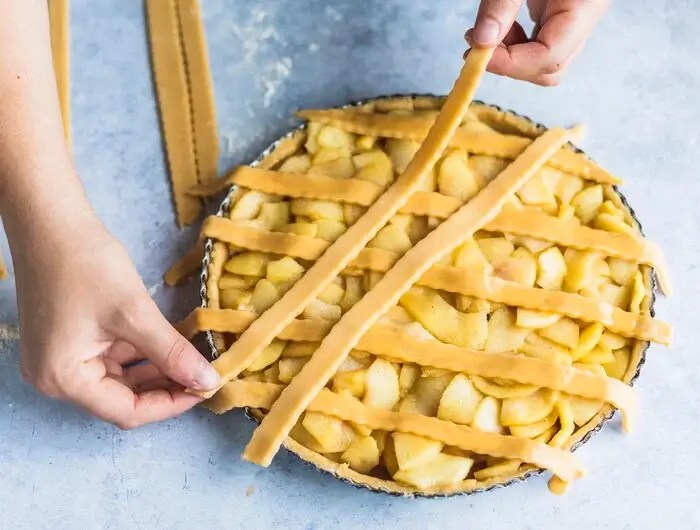 Aus dem dritten Teil ein Gitter machen. Der Kuchen wird bei 180 °C etwa 40 Minuten gebacken.