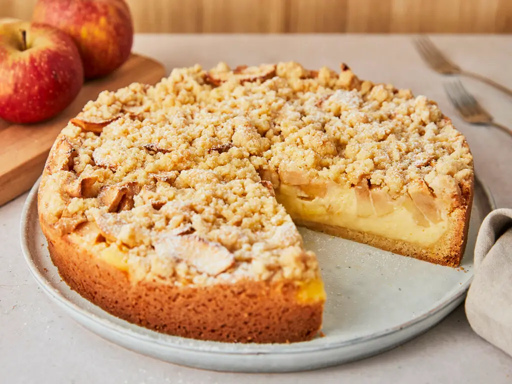 Jetzt zubereiten wie den Belag: die Äpfel schälen, achteln, das Kerngehäuse entfernen und in Scheiben schneiden. Das Puddingpulver mit dem Zucker und etwas Apfelsaft glatt rühren. Den restlichen Apfelsaft mit den Apfelstücken in einen Topf geben und 5 – 7 Min.dünsten lassen. Traumhaft lecker !
