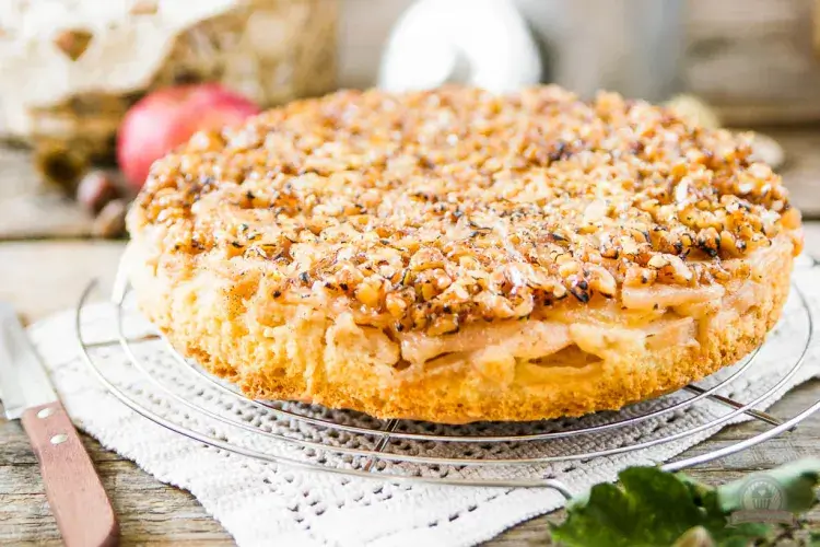Die Apfel-Walnuss-Masse drauf geben und glatt streichen. Den restlichen Teig als Streusel darauf geben und auf mittlerer Schiene bei 200°C ca 25-30 min backen.