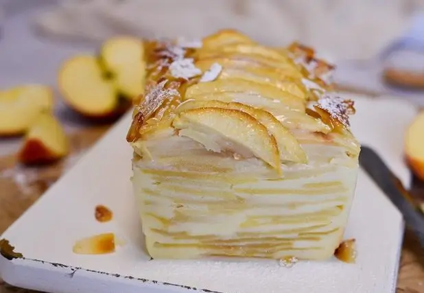 Puddingpulver, Mehl und Backpulver mischen. Mehl-Mischung und Milch abwechselnd unter den Teig heben. Äpfel unter den Teig heben. Teig in eine gefettete, mit Mehl ausgestäubte Springform (26 cm Ø) geben und glatt streichen. Kuchen im vorgeheizten Backofen (E-Herd: 175 °C/ Umluft: 150 °C/ Gas: s. Hersteller) ca. 45 Minuten backen.