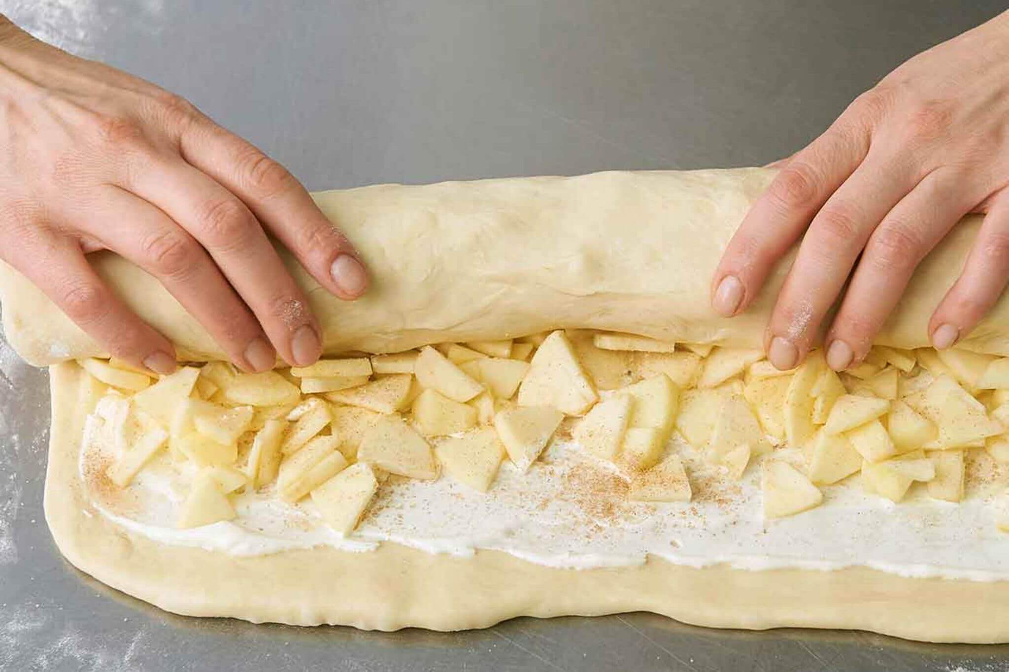 Lassen Sie den Teig sich verdoppeln. Den Teig kneten, die Äpfel füllen und aufrollen. Schneiden Sie es in Scheiben und lassen Sie es 30 bis 60 Minuten ruhen. Braten Sie sie in heißem Öl aus und wälzen Sie sie dann in Zucker.