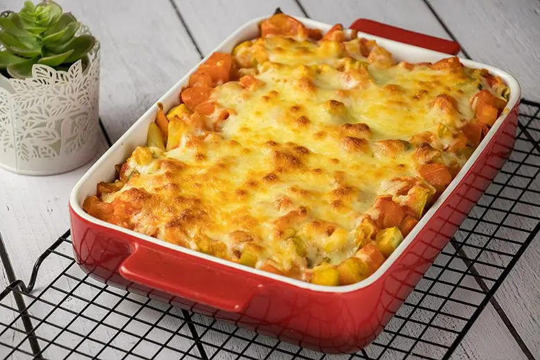 Nun das gekochte Gemüse in eine Auflaufform geben. Danach die Hackfleisch Sauce dazu geben und dann den Käse darüber verteilen.