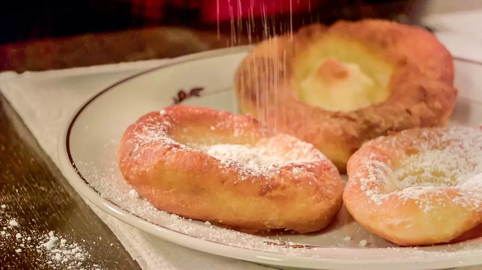 Die Teiglinge in der Mitte dünn ausziehen, ohne dass ein Loch entsteht und außen ein 2 cm breiter Rand bleibt. Man gibt sie schwimmend in heißes Ausbackfett, gießt mit einem EL heißes Fett über die Mitte, damit sie nicht einfallen, und backt sie goldgelb. Auf einem Küchentuch abtropfen lassen. Noch warm mit Puderzucker oder Zimtzucker bestreuen.
