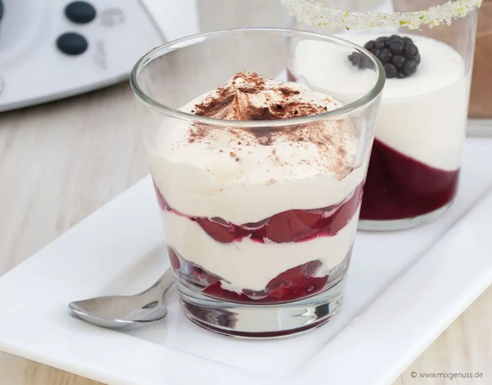 So geht es: 1. Bis auf die Sauerkirschen alle Zutaten mit einem Handrührgerät gut vermengen. Zum Schluss die abgetropften Sauerkirchen unterheben. Bis zum Verzehr im Kühlschrank ca. 2 – 3 Stunden gut durchziehen lassen. Fertig!