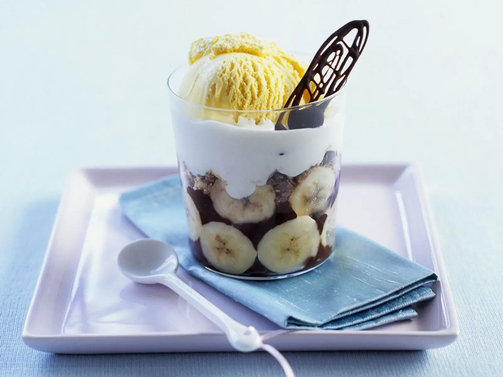 Die Hälfte der dunklen Creme auf Dessertgläser aufteilen, darauf Bananenscheiben legen, dann eine Schicht helle Creme darüber streichen, auf diese die zerbröckelten Kekse aufteilen, wieder dunkle Creme, Bananen, helle Creme – obenauf noch 2-3 Bananenscheiben und etwas Likör darüber gießen, 30 min kalt stellen.