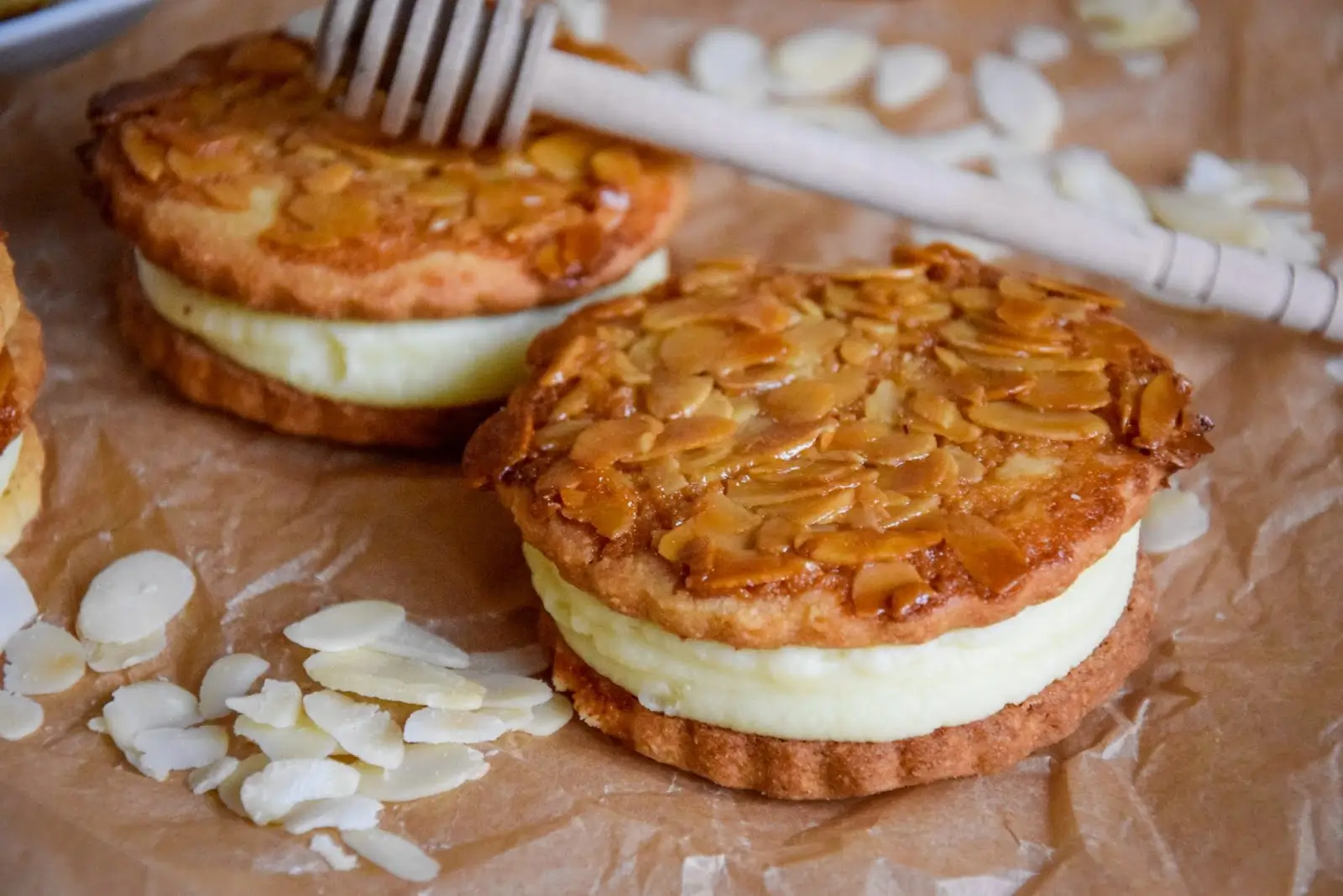 Für die Cremefüllung Kuvertüre fein hacken und über einem warmen Wasserbad schmelzen. Crème double und Kokosfett zur Kuvertüre geben, erwärmen und verrühren. Creme abkühlen lassen und in einen Spritzbeutel mit Lochtülle füllen. Creme auf die Plätzchen ohne Bienenstich-Guss spritzen. Bienenstich-Plätzchen daraufsetzen und fest werden lassen. Plätzchen im Kühlschrank lagern.