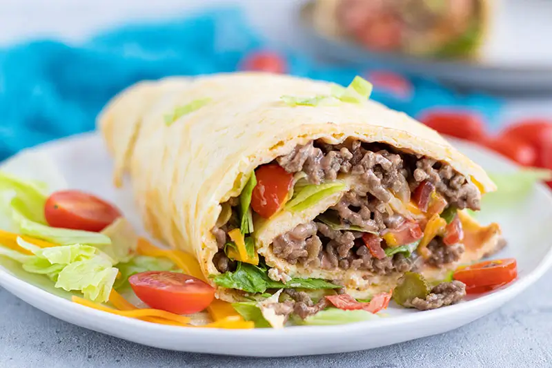 3. Als nachtes den Eisbergsalat in Mundgroße Stücke schneiden.Hol den Teig aus dem Ofen und bestreiche diesen mit der Soße. Jetzt die Zutaten der Füllung auf die Hälfte des Teiges geben. Den Teig zusammenklappen und noch einmal kurz in den Ofen geben.