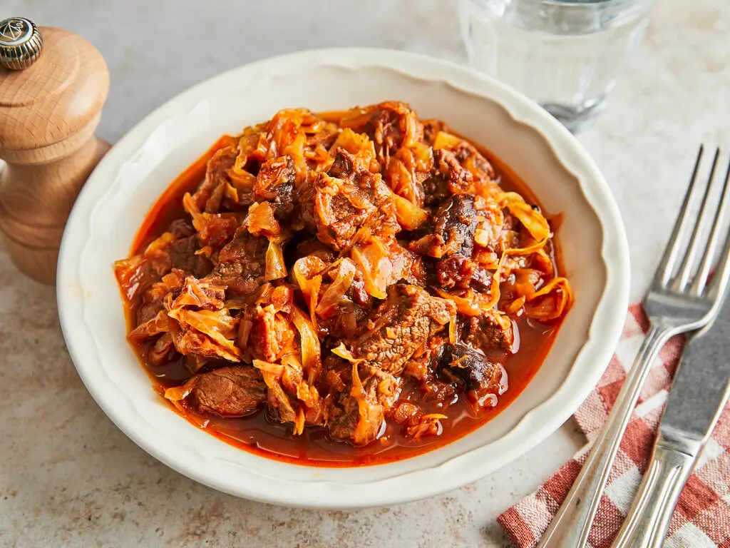 Das Sauerkraut kochen und zu dem Weißkraut geben. Gewürfelte Zwiebel, Lorbeerblätter, Wacholderbeeren, Tomatenmark und das ganze gebratene Fleisch mit dem Bratensaft dazugeben und gut durchmischen.