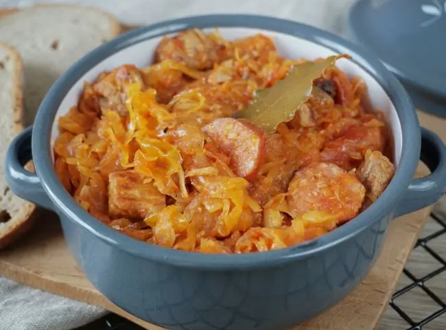 Das Sauerkraut kochen und zu dem Weißkraut geben. Gewürfelte Zwiebel, Lorbeerblätter, Wacholderbeeren, Tomatenmark und das ganze gebratene Fleisch mit dem Bratensaft dazugeben und gut durchmischen.