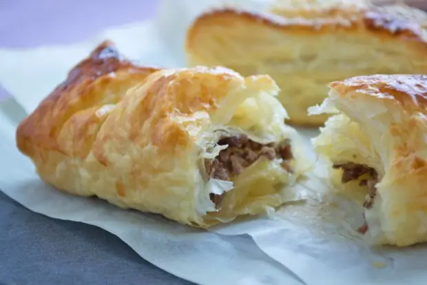 Die Blätterteigrollen ausrollen und in 6 gleich große Quadrate schneiden,die Hackfleisch-Käse Masse portionsweise in die Mitte geben und die Blätterteigtaschen über Eck zusammenfalten, so dass die Spitzen sich in der Mitte treffen.