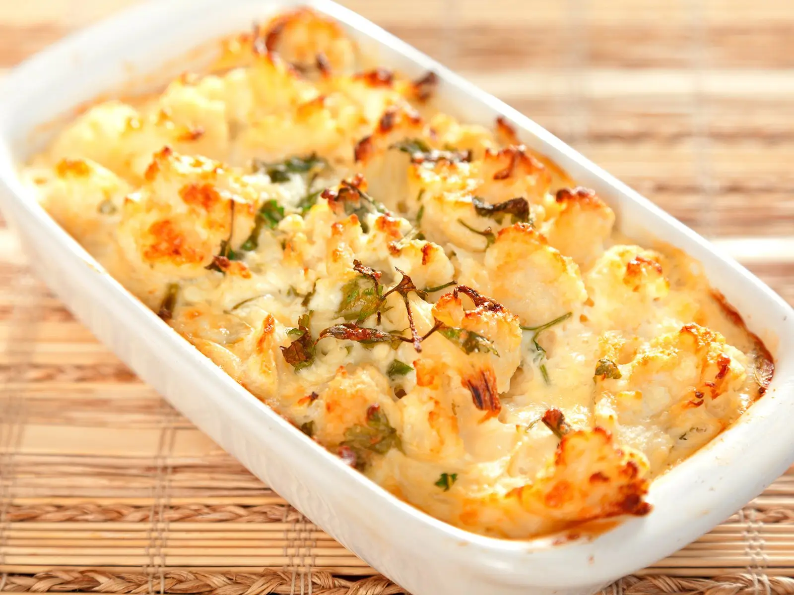 Nun eine Auflaufform ausfetten und zunächst die Kartoffelscheiben (gewürzt mit Muskatnuss), dann den Schinken, danach den Blumenkohl und zuletzt die Zwiebeln in die Form schichten. Mit der Hollandaise Sauce übergießen und mit dem geriebenen Käse bestreuen. Den Auflauf ca. 10 Minuten im Backofen überbacken lassen.