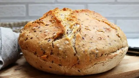 Jetzt mit einem weiteren Geschirrtuch abdecken und 1 Std. ruhen lassen.Danach den Teig mit Hilfe des Geschirrtuches in eine Glasbackform stürzen. Die Form mit Alufolie abdecken. Brot abgedeckt ca. 25 bis 30 Min backen. Alufolie abnehmen, weitere 15 Min backen.