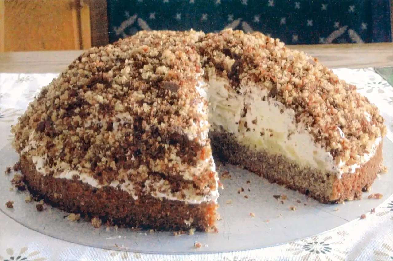 Boden erkalten lassen und das obere Drittel abschneiden. Dieses in Krümel zerpflücken.