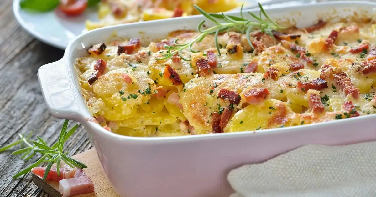 Den Backofen auf 200 °C vorheizen. Eine Backform mit Butter einfetten und die Kartoffelscheiben hineinlegen. Die Kartoffeln mit der Sahne-Soße übergießen, darauf die Zwiebel-Speck-Mischung verteilen und bei 200 °C vorerst 15 Minuten backen. Anschließend bei etwas niedrigerer Temperatur fertig backen. Kurz vorm Schluss mit den restlichen Speckwürfeln, etwas Käse und Petersilie bestreuen. Guten Appetit!