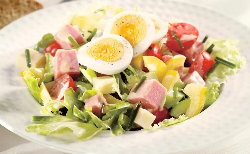 Eisbergsalat, Paprika, Zwiebel, Gurke, Schinken und Tomaten klein schneiden. Mit dem Käse vermengen.