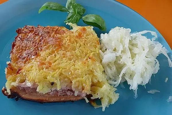 Rösti, Crème fraîche und Käse miteinander verrühren und kräftig mit Salz und Pfeffer abschmecken. Die Fleischscheiben nebeneinander auf das leicht gefettete Backblech legen und die Kartoffelmasse darauf verteilen.