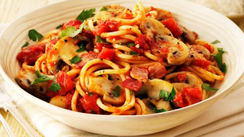 Nun mit Muskat, Pfeffer,Paprika und Salz würzen. Den Tomatenmark mit anschwitzen und dann mit das Wasser und Sahne ablöschen. Jetzt den Parmesan klein würfeln oder reiben und ebenfalls zur Soße geben. Nach Pfannengröße die Spaghetti ganz oder halbiert in die Pfanne geben und Gemüsebrühepulver sowie Petersilie Thymian und Rosmarin dazugeben.