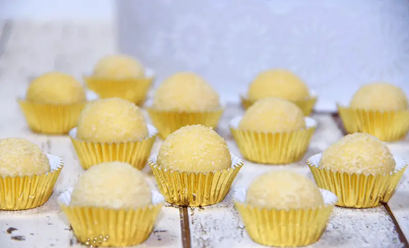 Mit Hilfe von einem Teelöffel kleine Mengen abstechen und zu Kugeln formen. Die Kugeln anschließend in den restlichen gemahlenen Mandeln wälzen und in Papierförmchen setzen. Kühl aufbewahren!