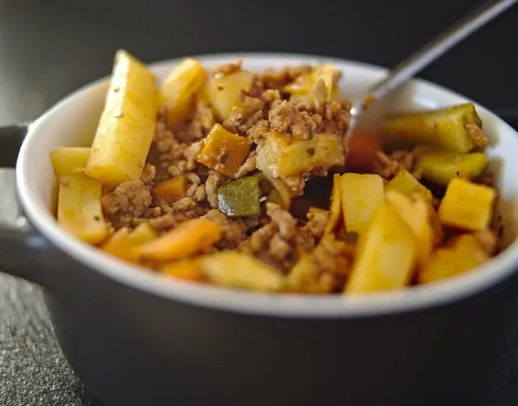 Als nachstes in einer Pfanne das Öl heiß werden lassen und das Hackfleisch darin krümelig anbraten. Die Zwiebeln zugeben und 2 – 3 Minuten mit braten. Nun Tomatenmark, Zucker, Wasser und 3 TL Brühe zugeben und ca. 5 Minuten kochen, bis die Flüssigkeit verdunstet ist.