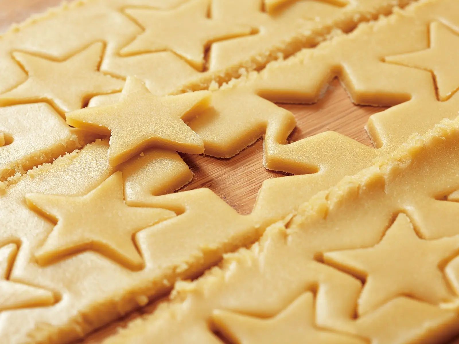 Das Backrohr auf 200 Grad Ober-/Unterhitze vorheizen und ein Backblech mit Backpapier auslegen. Den Teig auf einer bemehlten Arbeitsfläche ausrollen und nach beliebigen Formen Kekse ausstechen.