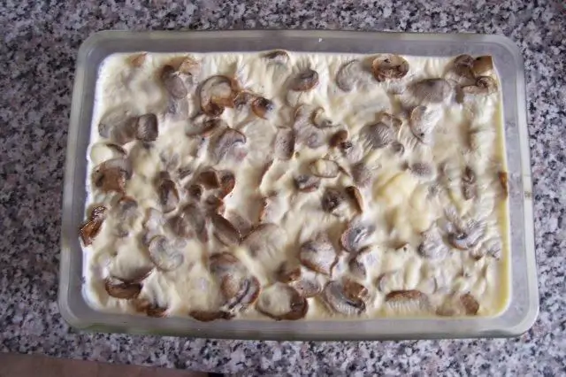 Schnitzel nach Hausfrauenart panieren und abbraten (nicht ganz gar, sonst nachher zu hart). Speck würfeln und anbraten, Zwiebeln dazu geben und glasig dünsten. Frische Champignons abbürsten und in 4-5 mm dicke Scheiben schneiden und mit andünsten, nicht matschig braten. Sahne hinzugeben. Mit Salz, Pfeffer, Oregano und Muskat abschmecken. Die Schnitzel in eine Auflaufform geben und mit der Sauce übergießen, mit Brühe ergänzen, bis die Schnitzel bedeckt sind. Im vorgeheizten Ofen auf 160°C ca. eine halbe Stunde garen lassen. Dazu passt Reis und ein frischer Blattsalat mit frischen Champignons.