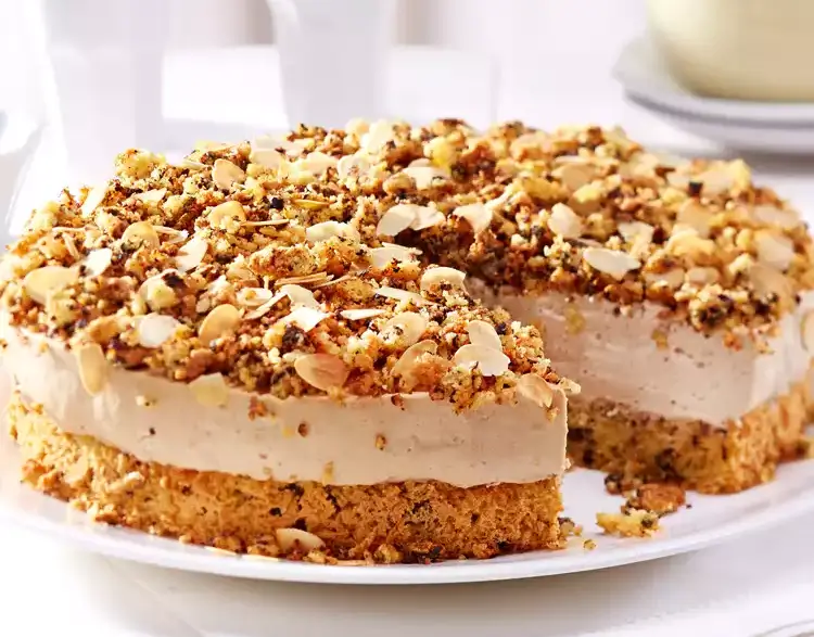 Die Sahne steif schlagen und dabei Sahnefestiger, Vanillin-Zucker und zum Schluss das Eiskaffee-Pulver einrieseln lassen. Die Eiskaffee-Sahne auf den Tortenboden streichen. Die Torte mit den Teigbröseln bestreuen und ca. 2 Stunden kalt stellen.
