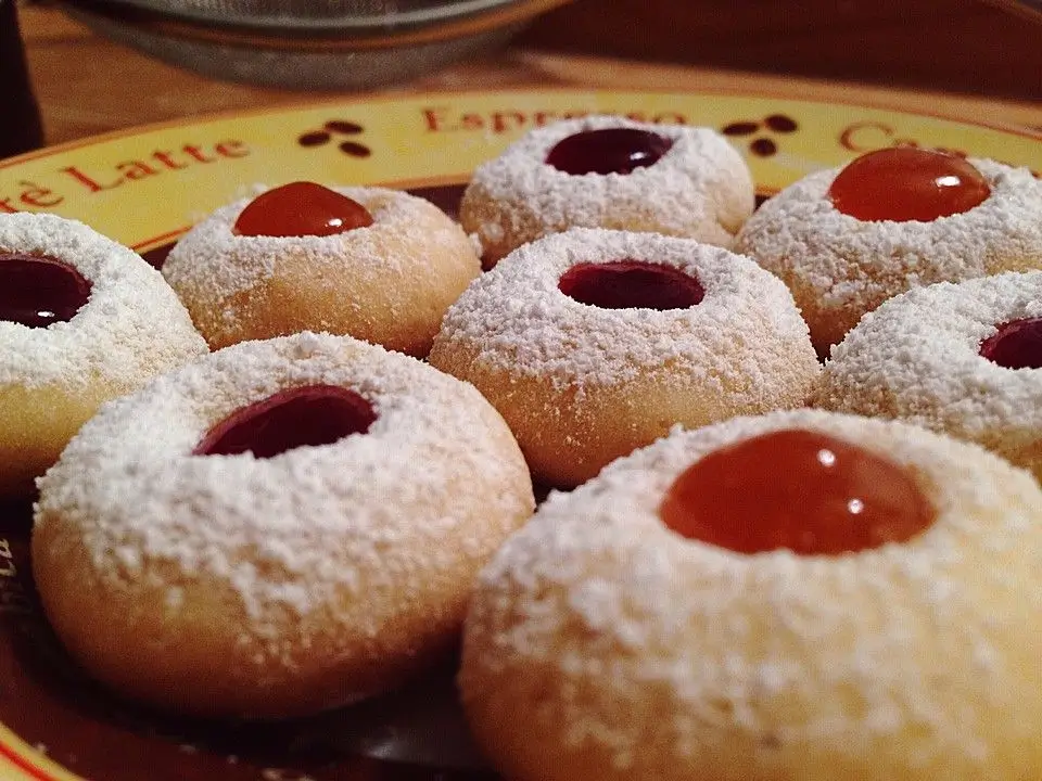 Die Konfitüre glatt rühren und mit einem Spritzbeutel (ich mache das immer mit einem kleinen Espressolöffel) in die Vertiefungen der Teigkugeln füllen.