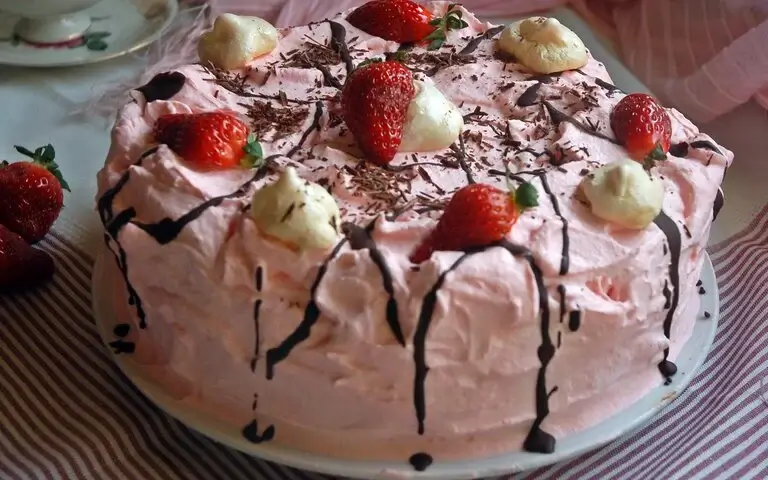 Als letztes die Eistorte mit Erdbeeren garnieren und sofort servieren.