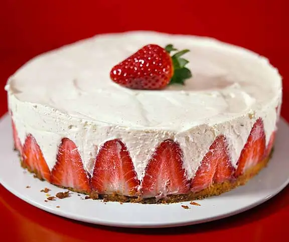 Der Kuchen kann natürlich mit schönen Sahnetupfen verziert werden, wenn man jedoch auf die Linie achten muss, sieht es auch mal ganz schön aus wenn man die übrigen Erdbeeren in Scheiben schneidet und sie als Kranz ringsum drapiert!