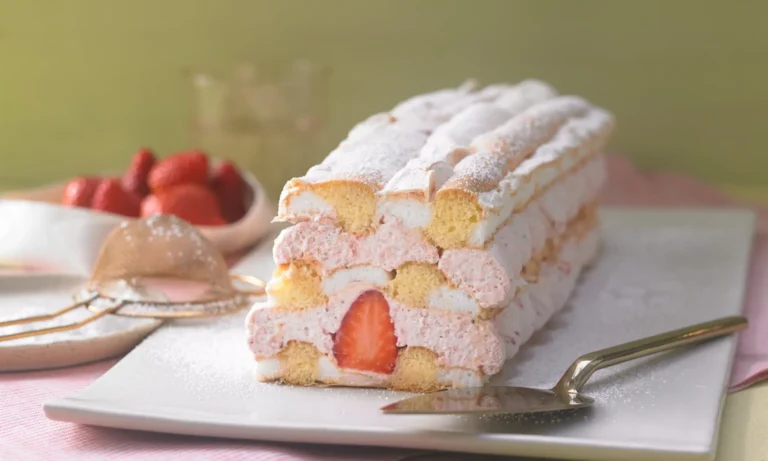 Das Obers steif aufschlagen, die geputzten Erdbeeren darunter heben und ebenfalls aufstreichen, zweiten Boden aufsetzen, mit Staubzucker bestreuen!