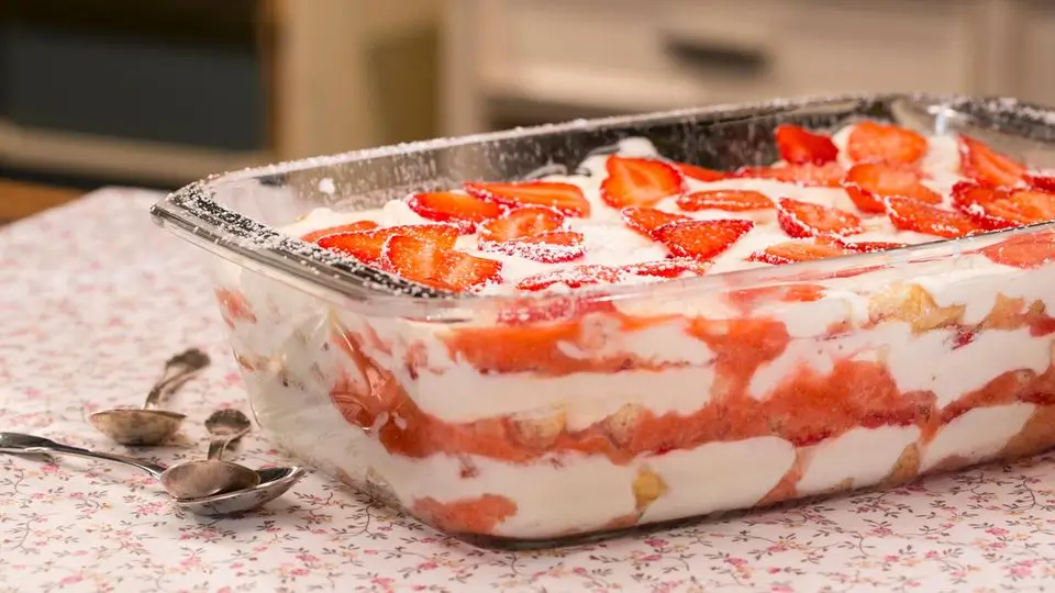 Erdbeeren waschen und das Grün entfernen. Erdbeeren in dünne Scheiben schneiden. Die erste Cremeschicht in der Auflaufform mit Erdbeerscheiben belegen.