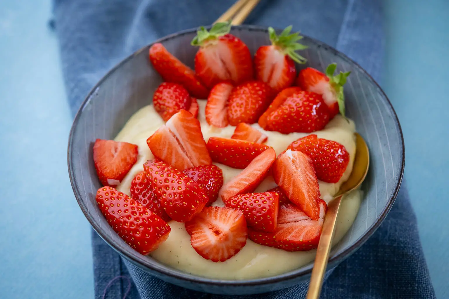 In Dessertschüsseln abwechselnd Erdbeeren und Pudding schichten. Den restlichen Schlagobers in die Schüsseln füllen und mit Streuseln dekorieren.