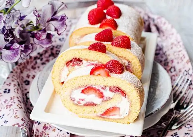 Die ausgekühlte Rolle wieder vorsichtig ausrollen und das Papier abziehen. Mit 300 g der Sahne bestreichen, die Erdbeerviertel darauf streuen. Aufrollen und mit Sahne bestreichen. Mit der restlichen Sahne und den beiseite gelegten Erdbeeren verzieren.