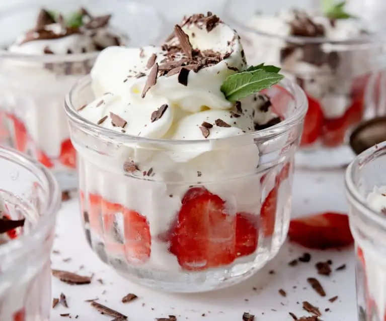 Die Creme und das Püree in Gläser schichten und noch 2 Stunden kühl stellen.