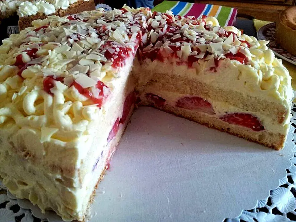 Den ausgekühlten Biskuit einmal durchschneiden. Den ersten Boden dünn mit der Creme bestreichen, mit den leicht gezuckerten Erdbeeren belegen und mit ca. einem Drittel der Creme bestreichen. Den zweiten Boden darauf legen und die Torte rundum bestreichen. Den Rest der Creme in einen Spritzbeutel mit kleinem Lochaufsatz füllen und als Spaghetti auf die Torte spritzen.