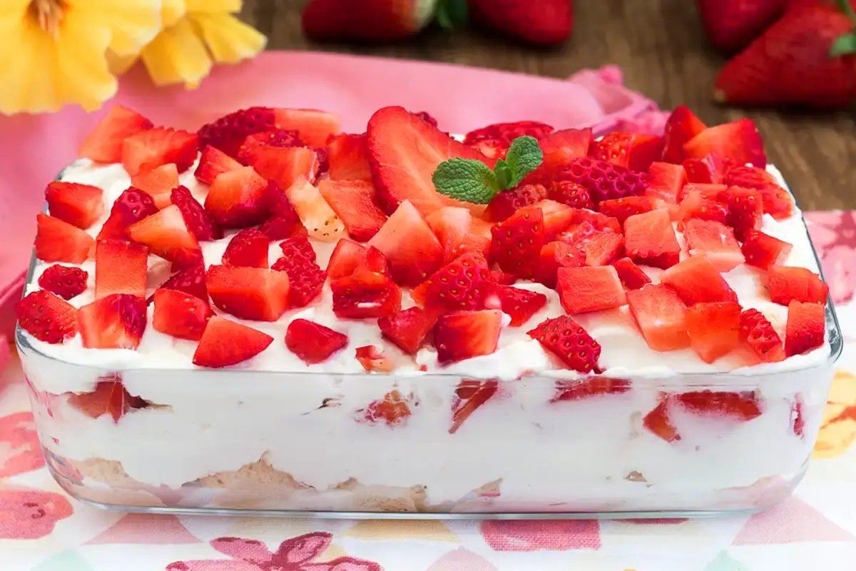 Nun ein Drittel der Amaretti (oder Löffelbiskuits) in einer Glasschale zerbröseln und jetzt abwechselnd das Erdbeerpüree, die Mascarponecreme und die Erdbeerscheiben solange in Schichten übereinander geben, bis alles aufgebraucht ist. Das Tiramisu mindestens eine Stunde in den Kühlschrank stellen. Mit einem Rest der Erdbeerscheiben garnieren.
