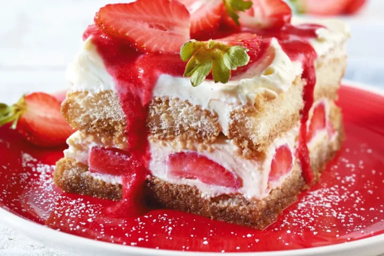 Die Torte zum Schluss mit Kakaopulver bestäuben, mit Sahne und übrigen geviertelten Beeren verzieren.