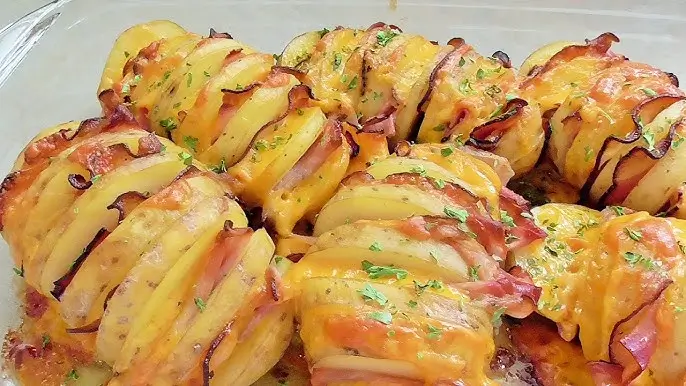 2. Für die Sauce KNORR Basis Spaghetti Carbonara mit Milch laut Anweisung zubereiten. Kartoffeln waschen, schälen und in kurzen Abständen ca. zwei Drittel tief fächerförmig einschneiden. Speck und Käse in Streifen schneiden und in die Einschnitte legen.