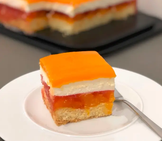 600 ml Sahne mit 3 Sahnesteif und 3 Vanillinzucker steif schlagen und auf der Mandarinenmasse verteilen. 3 Pck. Vanillesauce mit dem Multivitaminsaft verrühren und auf die Sahne gießen. Den Kuchen bis zum Verzehr kalt stellen.