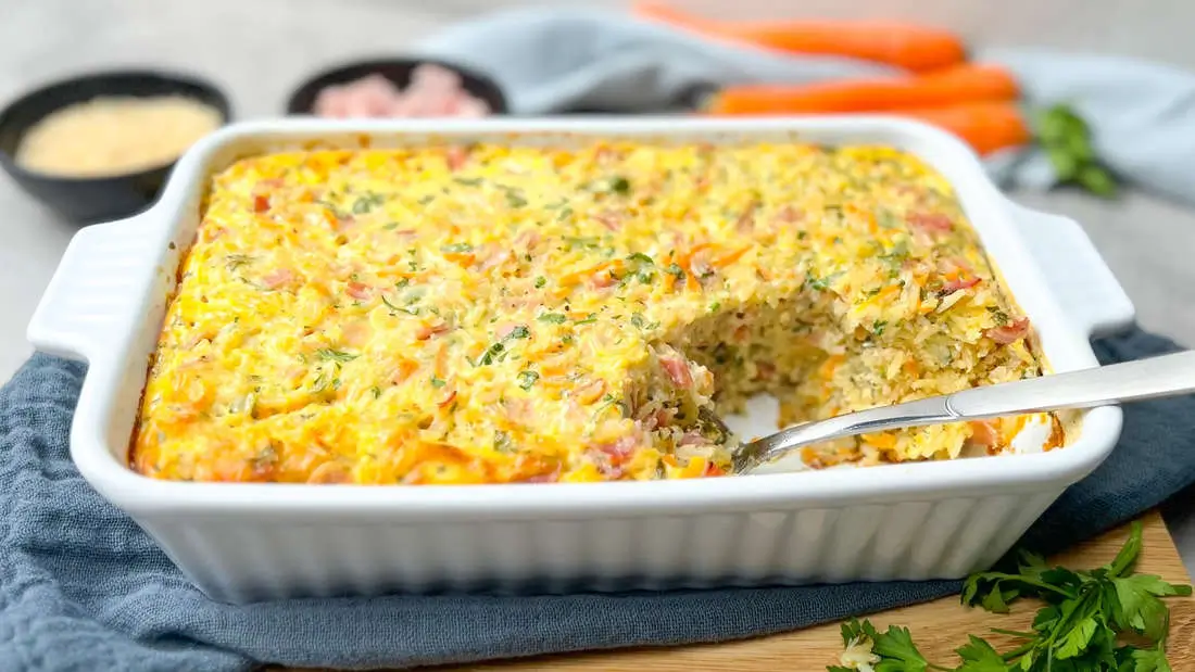 In einer großen Schüssel den gekochten Reis, den geriebenen Mozzarella, den klein geschnittenen Putenschinken, die geriebene Möhre, die gehackte Petersilie, die in Milch verquirlten Eier, den Sahne-Schmelzkäse und eine halbe Tasse geriebener Parmesan vermengen. Salzen und pfeffern. Gründlich verrühren und diese Reis-Mischung in eine mit Öl eingefettete Auflaufform geben.