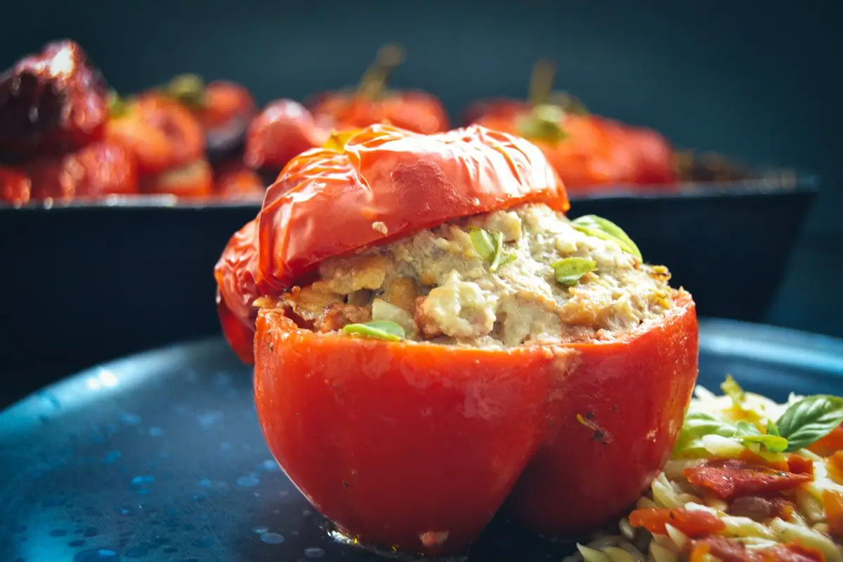 Die Masse in die halben Paprika füllen und bei 200 Grad für 30 Minuten backen. Ich habe noch obendrauf je eine Scheibe Saint Albray gelegt.