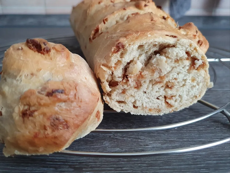 Den Pizzateig ausrollen und mit dem Frischkäse bestreichen. Die Zwiebel in Ringe oder auch in Würfel schneiden und ebenfalls auf den Teig legen. Den Pizzateig von der kurzen Seite her aufrollen und auf ein mit Backpapier belegtes Backblech legen. Die Teigrolle etwas platt drücken und 3 mal der Länge nach tief einschneiden.