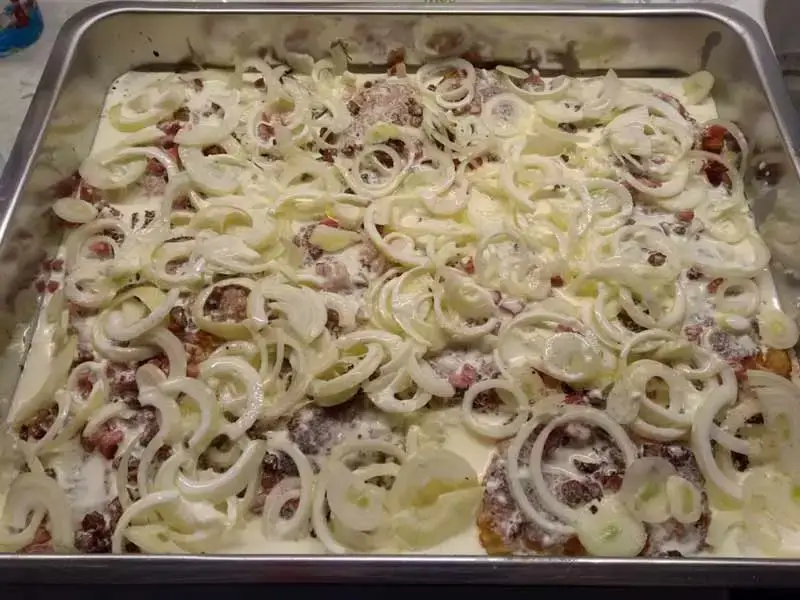 Als nachtes Porree putzen, waschen, das Grün entfernen und nur das Weiße in Ringe schneiden, auch auf den Schnitzeln verteilen. Sahne und Schmand verrühren, mit Salz, Pfeffer, Paprika, Curry würzen. Die Jägersauce in die kalte Sahne einrühren und über die Schnitzel in der Fettpfanne gießen.
