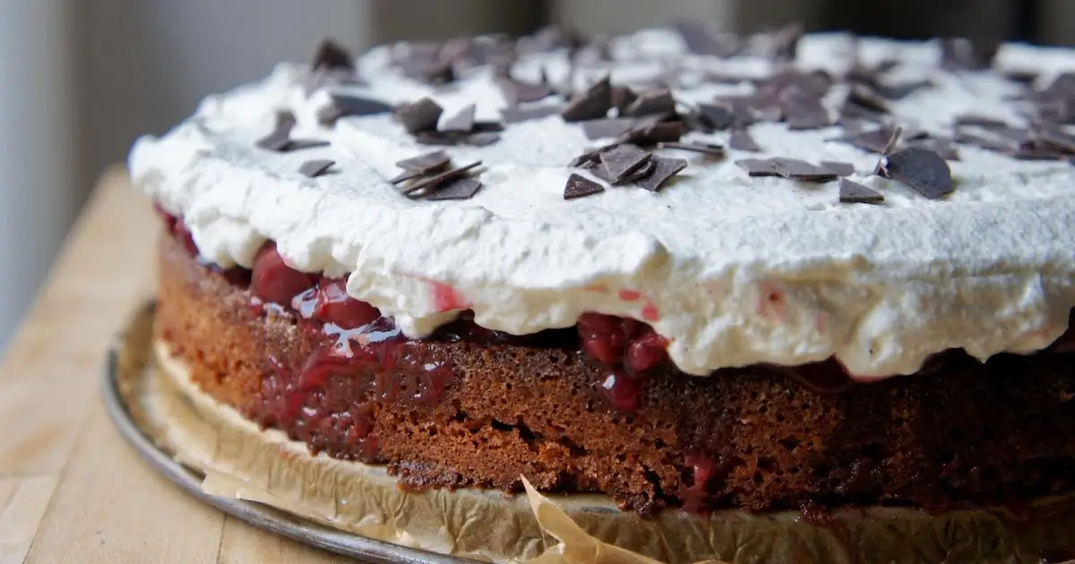 Die Schlagsahne schlagen und auf den Kuchen geben. Mit Schokoladenraspel verziert servieren.