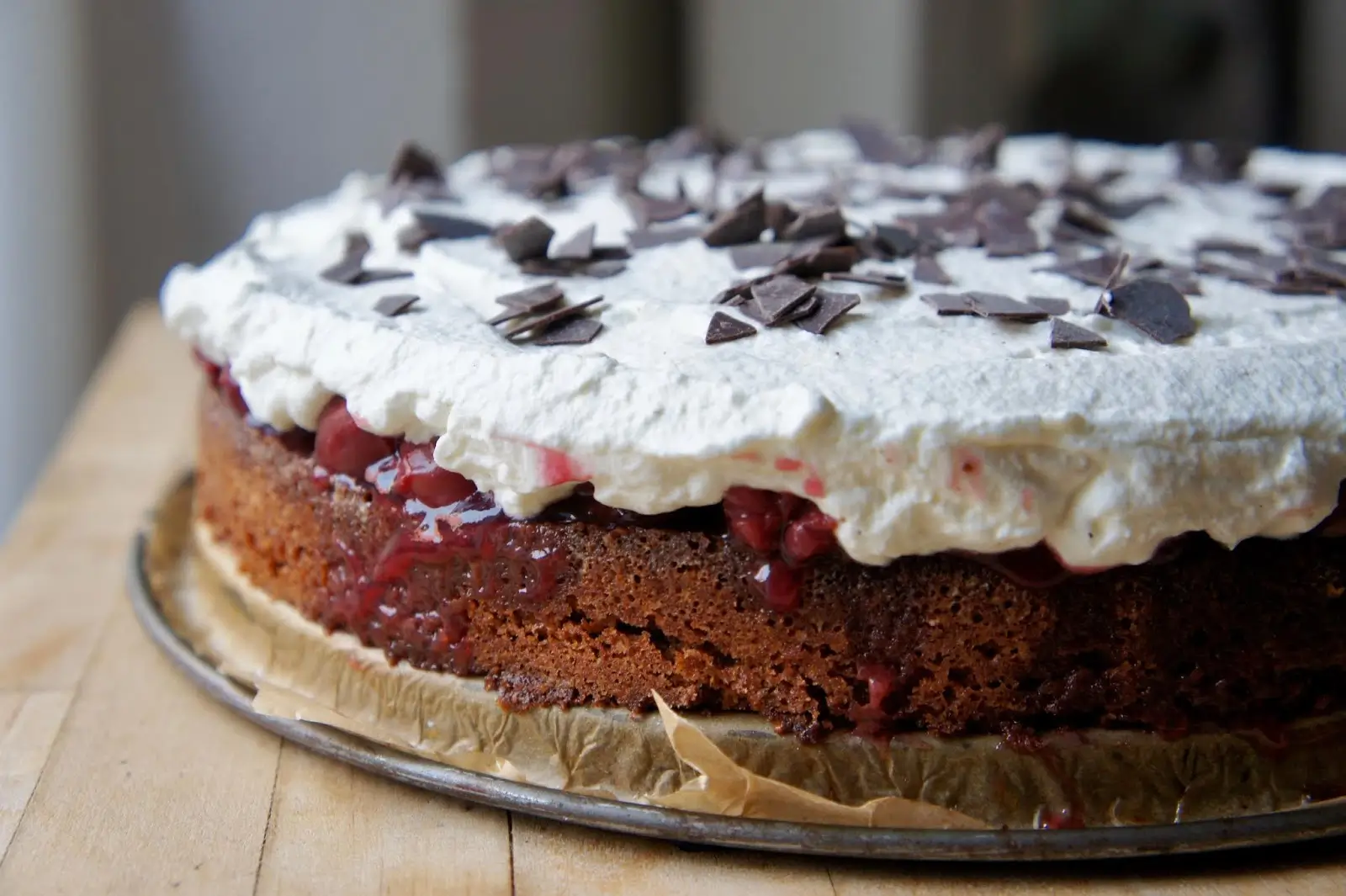 Die Schlagsahne schlagen und auf den Kuchen geben. Mit Schokoladenraspel verziert servieren.