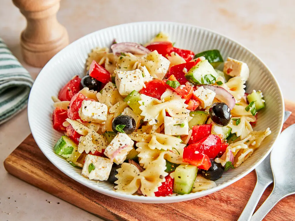 Die Gurke schälen und klein schneiden, die Knoblauchzehen durchpressen, die Zwiebel in feine Würfel schneiden, die Paprikaschoten putzen und in Stücke schneiden, die Tomaten würfeln, den Schafskäse würfeln und die Oliven eventuell halbieren. Alles zusammen zu den Nudeln in eine große Schüssel geben und gut verrühren.