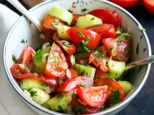 Die Gurke schälen, halbieren und schneiden. Die Tomaten waschen, den Strunk entfernen und die Tomaten vierteln. Alles in eine Schüssel geben, das Salz unterheben und ziehen lassen.
